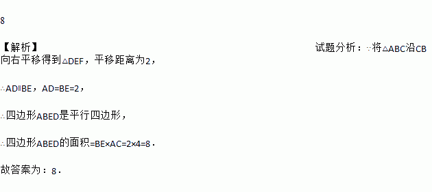 如图所示,在Rt△ABC中,∠C=90°,AC=4,将△ABC沿CB向右平移得到△DEF,若平移距离为2,则四边形ABED的面积等于 .