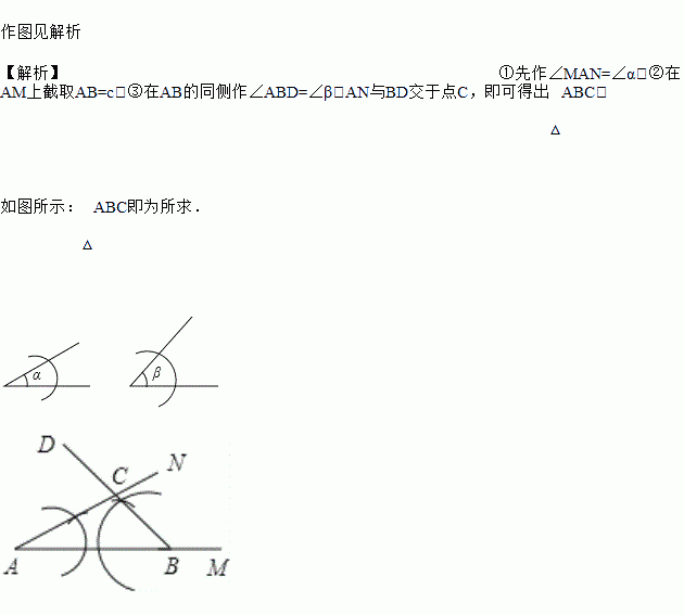 已知∠α,∠β和线段c,求作△ABC,使∠A= ∠α,∠B=∠β,AB=c.(不写作法,保留痕迹)