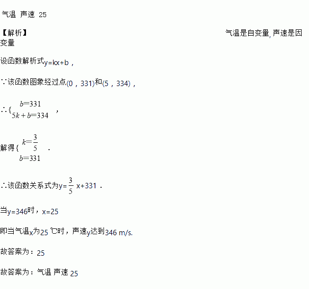 气温 声速 25 【解析】气温是自变量, 声速是因变量 设函数解析式y=kx+b, ∵该函数图象经过点(0,331)和(5,334), ∴, 解得. ∴该函数关系式为y=x+331 . 当y=346时,x=25 即当气温x为25 ℃时,声速y达到346 m/s. 故答案为:25 故答案为:气温 声速 25