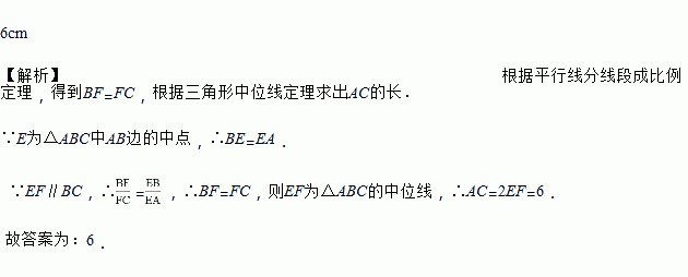 如图,E为△ABC中AB边的中点,EF∥AC交BC于点F,若EF=3cm,则AC=____________.