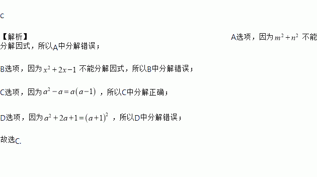C 【解析】A选项,因为不能分解因式,所以A中分解错误; B选项,因为不能分解因式,所以B中分解错误; C选项,因为,所以C中分解正确; D选项,因为,所以D中分解错误; 故选C.