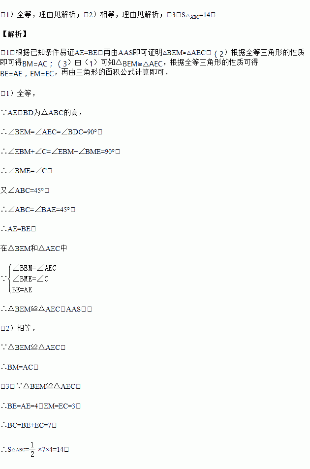 已知:如图所示,△ABC中,∠ABC=45°,高AE与高BD交于点M,BE=4,EM=3.