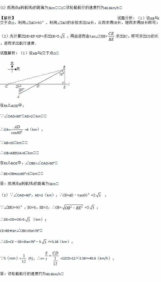 的距离为2km,点B位于点A北偏东60°方向且与A相距10km处.现有一艘轮船从位于点B南偏西76°方向的C处,正沿该航线自西向东航行,5min后该轮船行至点A的正北方向的D处.