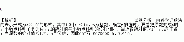 国家教育部最近提供的数据娃示,2008年全国普通高考计划招生667万人,这一数据科学记数法表示为(结果保留两个有效数字) ( )