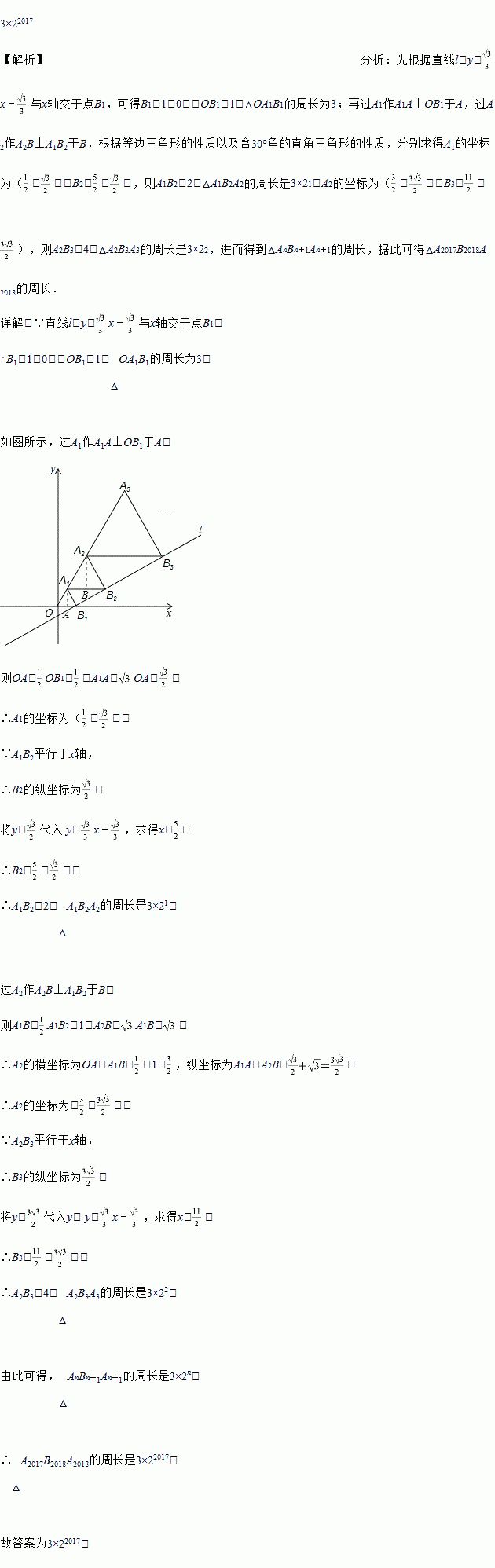 与x轴交于点B1,以OB1为一边在OB1上方作等边三角形A1OB1,过点A1作A1B2平行于x轴,交直线l于点B2,以A1B2为一边在A1B2上方作等边三角形A2A1B2,过点A2作A2B3平行于x轴,交直线l于点B3,以A2B3为一边在A2B3上方作等边三角形A3A2B3,…,则△A2017B2018A2018的周长是_____.