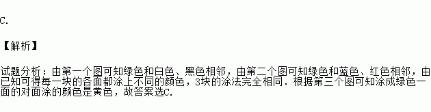 C. 【解析】 试题分析:由第一个图可知绿色和白色、黑色相邻,由第二个图可知绿色和蓝色、红色相邻,由已知可得每一块的各面都涂上不同的颜色,3块的涂法完全相同.根据第三个图可知涂成绿色一面的对面涂的颜色是黄色,故答案选C.