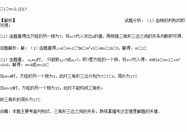 (2)已知等腰的一边长为7,若、恰好是另外两边长,求这个三角形的周长.