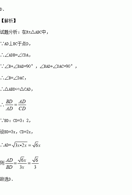如图,Rt△ABC中,∠BAC=90°,AD⊥BC于点D,若BD:CD=3:2,则= ( )