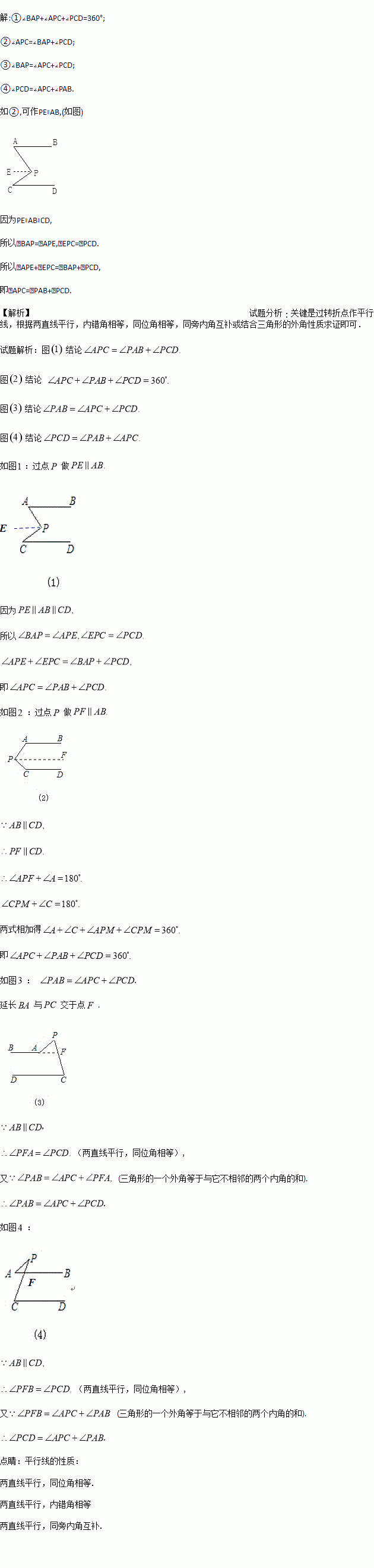 如图,AB∥CD,分别探讨下面四个图形中∠APC与∠PAB,∠PCD的关系,请你从所得的关系中任意选取一个加以说明.