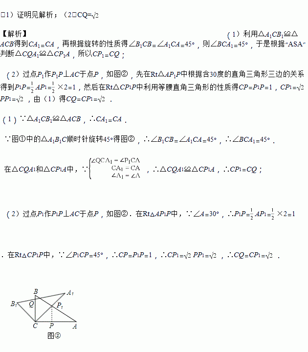 (1)将图①中的△A1B1C顺时针旋转45°得图②,点P1是A1C与AB的交点,点Q是A1B1与BC的交点,求证:CP1=CQ;