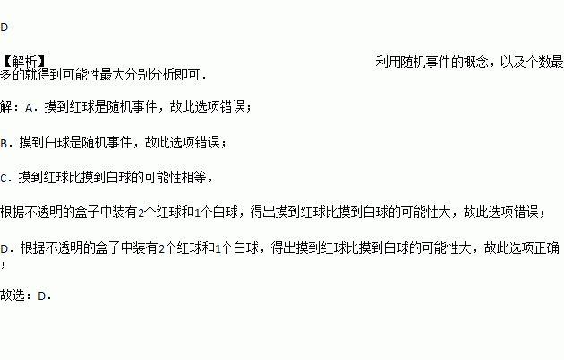 一个不透明的盒子中装有2个红球和1个白球,它们除颜色外都相同.若从中任意摸出一个球,则下列叙述正确的是( )
