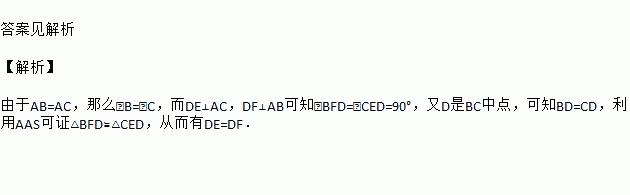 如图,在△ABC中,AB=AC,D为BC的中点,DE⊥AB,DF⊥AC,垂足分别为E、F,求证:DE=DF.