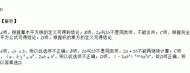 C. (a﹣b)2=a2﹣b2 D. (﹣3ab2)2=9a2b4