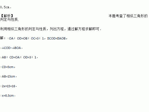 如图,零件的外径为16cm,要求它的壁厚x,需要先求出内径AB,现用一个交叉钳(AD与BC相等)去量,若测得OA︰OD=OB︰OC=3︰1,CD=5cm,你能求零件的壁厚x吗?