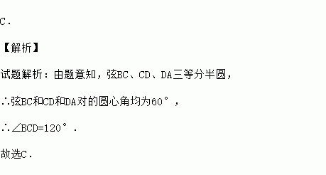 如图,AB 是圆O的直径,B C,CD,DA是圆O的弦,且BC=CD=DA,则∠BCD等于 ( )