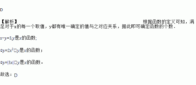 下列关于x、y的关系式中:①x-y=3;②y=2x2;③y=|3x|.其中表示y是x的函数的是( )