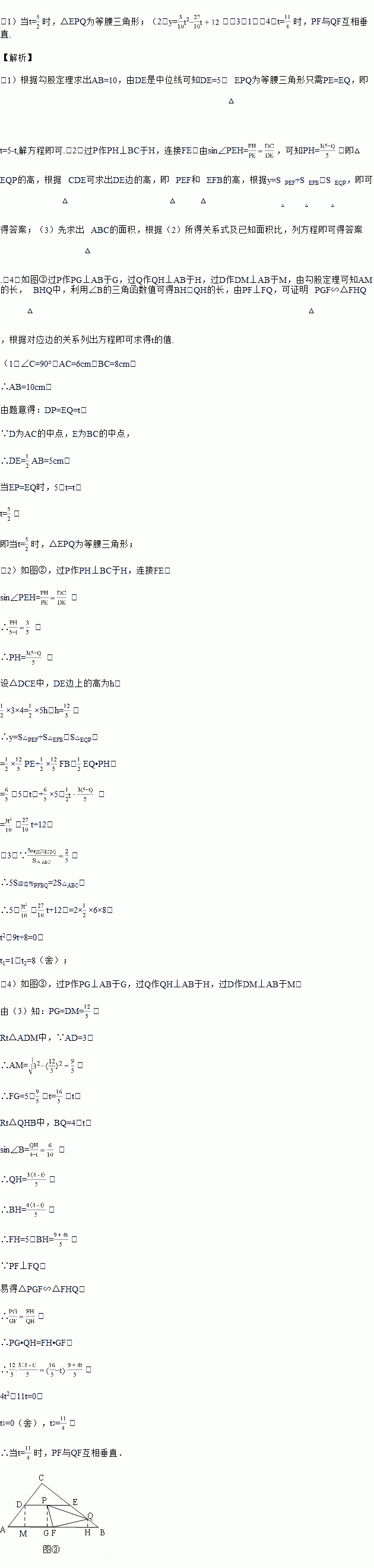 Èçͼ£¬ÔÚ¡÷ABCÖУ¬¡ÏC=90¡ã£¬AC=6cm£¬BC=8cm£¬D¡¢E¡¢F·Ö±ðÊÇAC¡¢BC¡¢ABµÄÖе㣬Á¬½ÓDE£®µãP´ÓµãD³ö·¢£¬ÑØDE·½ÏòÔÈËÙÔ˶¯£»Í¬Ê±£¬µãQ´ÓµãE³ö·¢£¬ÑØEB·½ÏòÔÈËÙÔ˶¯£¬Á½ÕßËٶȾùΪ1cm/s£»µ±ÆäÖÐÒ»µãÍ£Ö¹Ô˶¯Ê±£¬ÁíÍâÒ»µãҲֹͣÔ˶¯£®Á¬½ÓPQ¡¢PF£¬ÉèÔ˶¯Ê±¼äΪts£¨0£¼t£¼4£©£®½â´ðÏÂÁÐÎÊÌ⣺