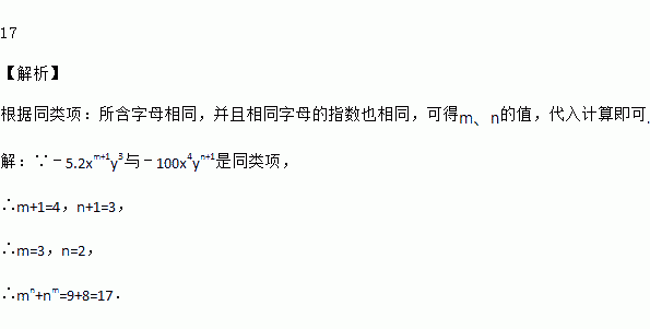 已知﹣5.2xm+1y3与﹣100x4yn+1是同类项,求:mn+nm .