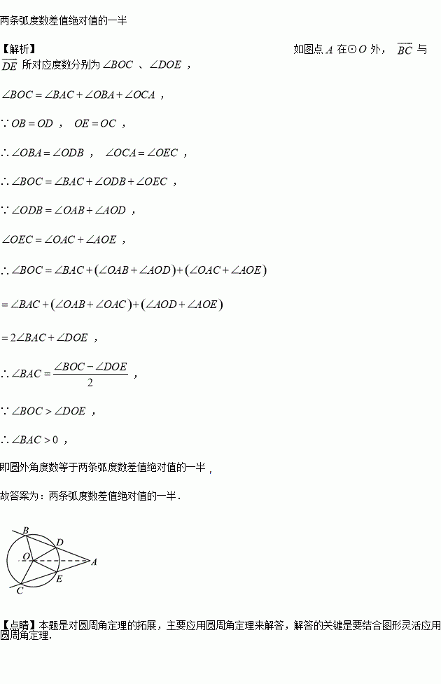 顶点在圆外,并且两边都和圆相交的角叫做圆外角.圆外角的两边所夹的两条弧的度数与该角的度数之间的数量关系是:圆外角的度数等于__________.