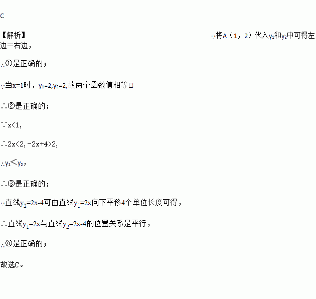 已知直线y1=2x与直线y2= -2x+4相交于点A.有以下结论:①点A的坐标为A(1,2);②当x=1时,两个函数值相等;③当x<1时,y1<y2④直线y1=2x与直线y2=2x-4在平面直角坐标系中的位置关系是平行.其中正确的是( )