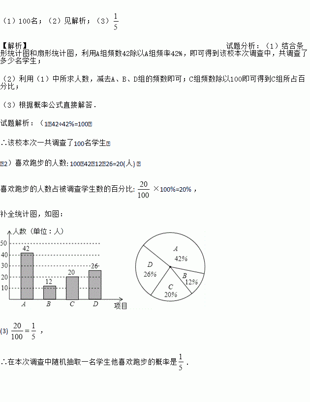 (3)在本次调查的学生中随机抽取1人,他喜欢“跑步”的概率有多大?