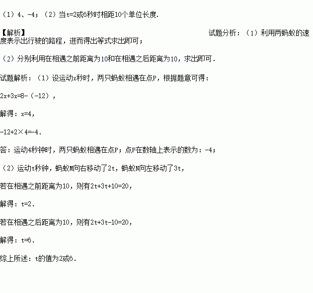 点A、B在数轴上表示的数分别为﹣12和8,两只蚂蚁M、N分别从A、B两点同时出发,相向而行.M的速度为2个单位长度/秒,N的速度为3个单位长度/秒.