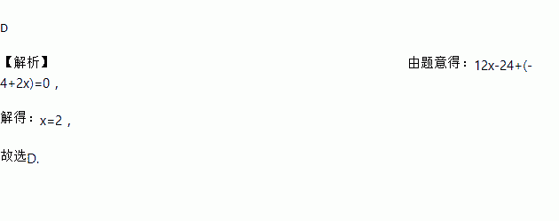 D 【解析】由题意得:12x-24+(-4+2x)=0, 解得:x=2, 故选D.
