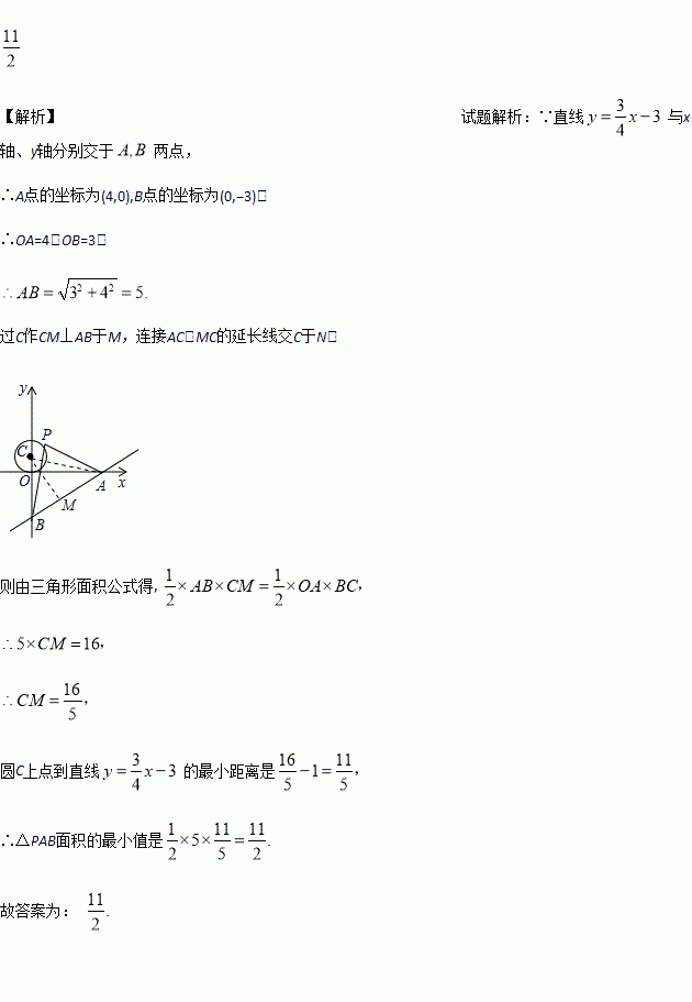 如图,已知直线与x轴、y轴分别交于A、B两点,P是以C(0,1)为圆心,1为半径的圆上一动点,连结PA、PB.则△PAB面积的最小值是__________.