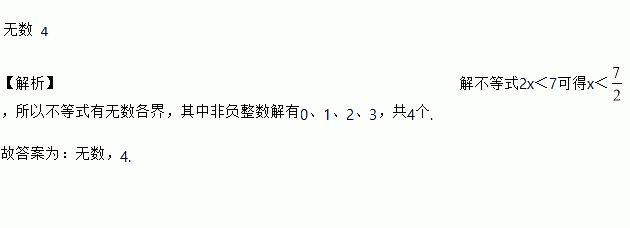 不等式2x<7的解有_____个,其中非负整数解有___个.
