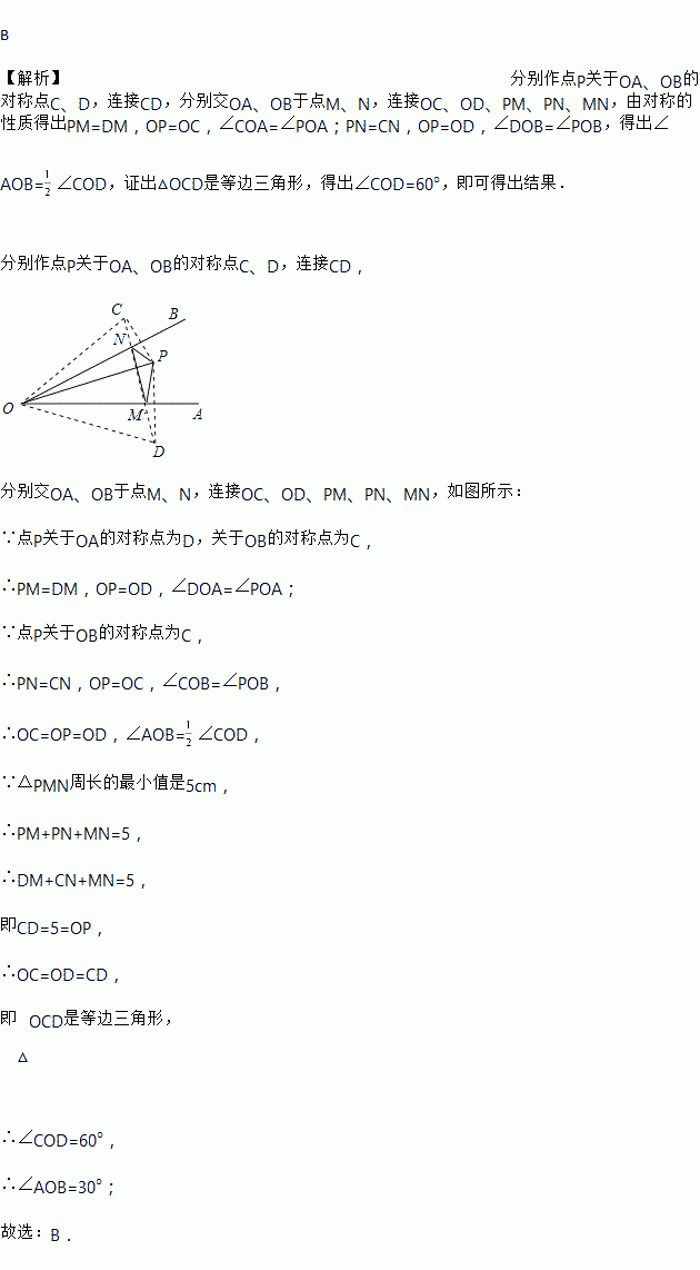 如图,点是内任意一点,,点和点分别是射线和射线上的动点周长的最小值是,则的度数是( )