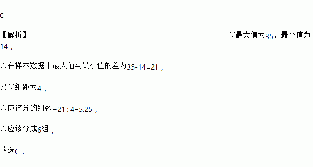 C 【解析】∵最大值为35,最小值为14, ∴在样本数据中最大值与最小值的差为35-14=21, 又∵组距为4, ∴应该分的组数=21÷4=5.25, ∴应该分成6组, 故选C.