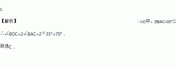 C 【解析】∵⊙O中,∠BAC=35°, ∴∠BOC=2∠BAC=2×35°=70°. 故选C.