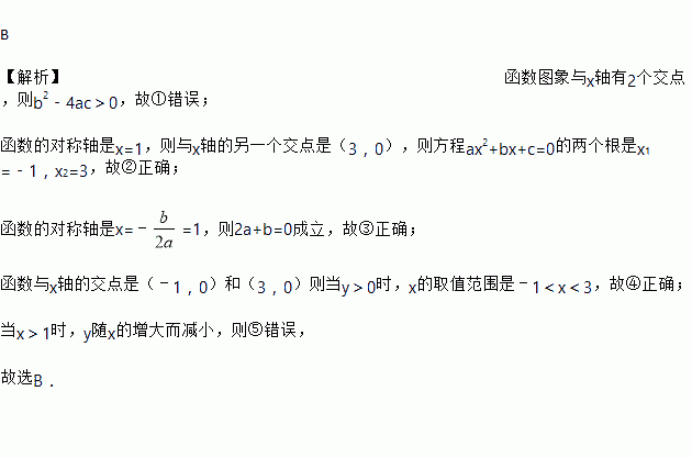 B 【解析】函数图象与x轴有2个交点,则b2﹣4ac>0,故①错误; 函数的对称轴是x=1,则与x轴的另一个交点是(3,0),则方程ax2+bx+c=0的两个根是x1=﹣1,x2=3,故②正确; 函数的对称轴是x=﹣=1,则2a+b=0成立,故③正确; 函数与x轴的交点是(﹣1,0)和(3,0)则当y>0时,x的取值范围是﹣1<x<3,故④正确; 当x>1时,y随x的...