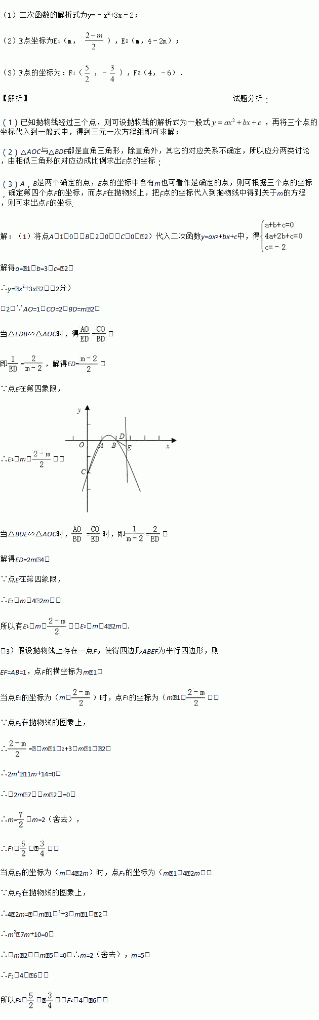 (2)在直线x=m(m>2)上有一点E(点E在第四象限),使得E、D、B为顶点的三角形与以A、O、C为顶点的三角形相似,求E点坐标(用含m的代数式表示);