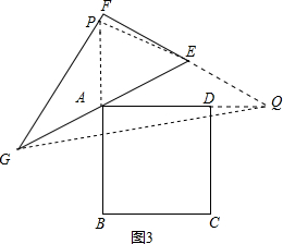 £¨3£©Èô½«Rt¡÷EFGÈÆ×ŵãAÄæÊ±ÕëÐýת¦Á£¨90¡ã£¼¦Á£¼180¡ã£©£¬Á½Ö±½Ç±ß·Ö±ð½»BA¡¢ADÁ½±ßÑÓ³¤ÏßÓÚP¡¢QÁ½µã£¬²¢ÅжÏËÄÌõÏß¶ÎEP¡¢PF¡¢FQ¡¢QGÖ®¼ä´æÔÚºÎÖÖÈ·¶¨µÄÏàµÈ¹ØÏµ£¿°´ÌâÒâÍêÉÆÍ¼3£¬ÇëÖ±½Óд³öÄãµÄ½áÂÛ£¨²»ÓÃÖ¤Ã÷£©£®