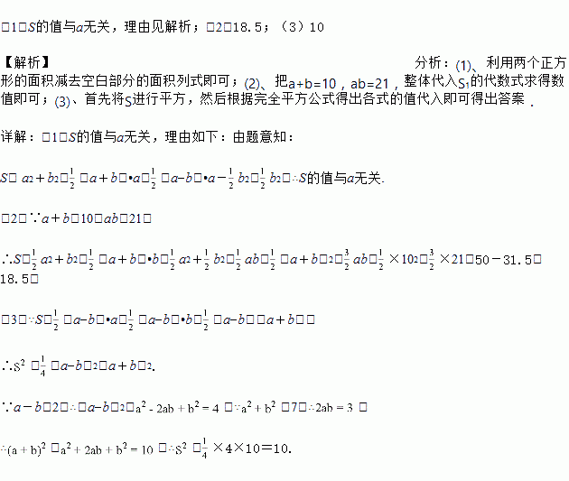 (2)如图②,若a+b=10,ab=21,求S的值;