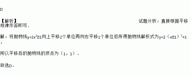 D 【解析】试题分析:直接根据平移规律作答即可. 【解析】 将抛物线y=2x2﹣1向上平移2个单位再向右平移1个单位后所得抛物线解析式为y=2(x﹣1)2+1, 所以平移后的抛物线的顶点为(1,1). 故选D.