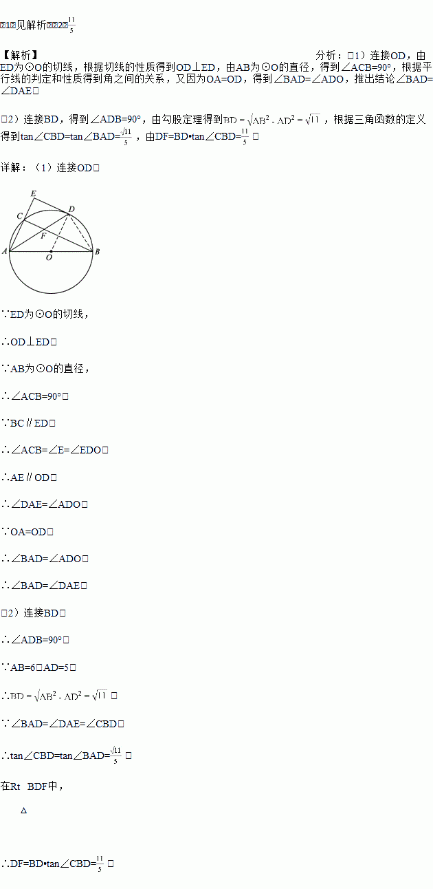 如图,△ABC内接于⊙O,AB为直径,点D在⊙O上,过点D作⊙O切线与AC的延长线交于点E,ED∥BC,连接AD交BC于点F.