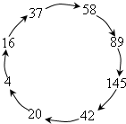 解:以数37658为例:37658→32+72+62+52+82=183,12+82+32=74,72+42=65,62+52=61,62+12=37,32+72=58,52+82=89,82+92=145,12+42+52=42,42+22=20,22+02=4,42=16,12+62=37,32+72=58,…→