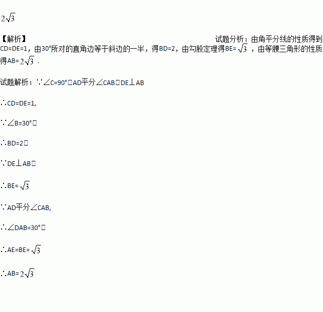 如图,在△ABC中,∠C=90°,AD平分∠CAB,交CB于点D,过点D作DE⊥AB于点E,若∠B=30°,CD=1,求AB的长。