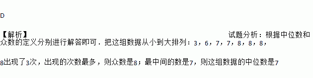 一组数据8,3,8,6,7,8,7的众数和中位数分别是( )