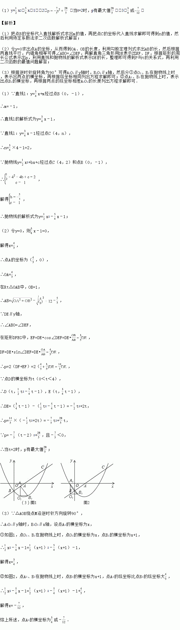 (2)点D在抛物线上,且点D的横坐标为t(0<t<4).DE∥y轴交直线l于点E,点F在直线l上,且四边形DFEG为矩形(如图2).若矩形DFEG的周长为p,求p与t的函数关系式以及p的最大值;