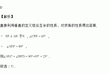 如图,直线AB、CD相交于点E,EF⊥AB于E,若∠CEF=65°,则∠DEB的度数为( )