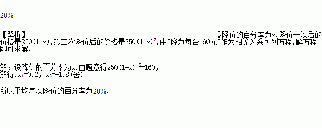某种商品两个月内从每件250元降低到了160元,平均每月降价的百分率是____.