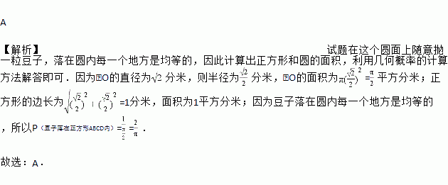 如图,正方形ABCD内接于⊙O,⊙O的直径为分米,若在这个圆面上随意抛一粒豆子,则豆子落在正方形ABCD内的概率是( ).