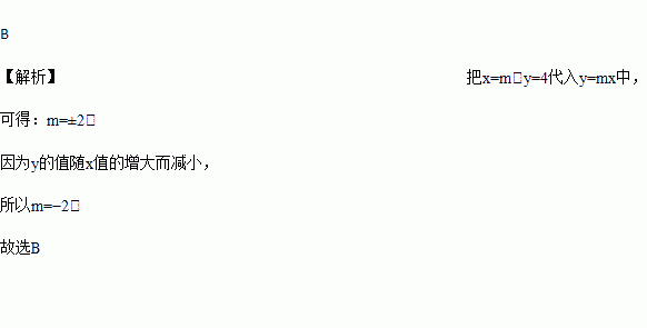 设正比例函数y=mx的图象经过点A(m,4),且y的值随x值的增大而减小,则m=( )