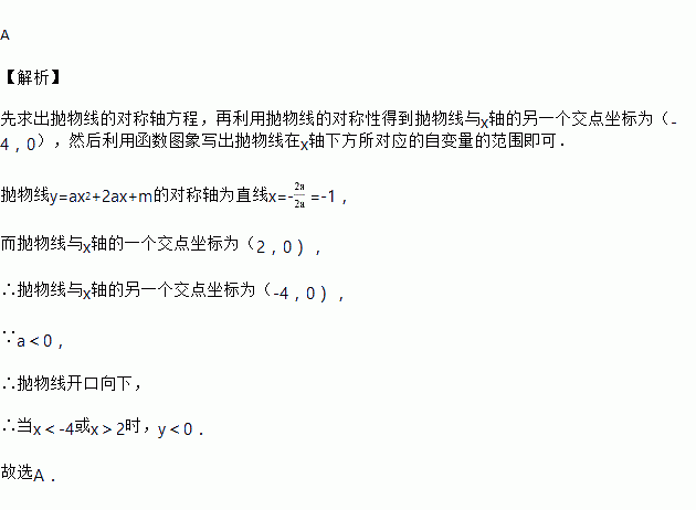 函数y=ax2+2ax+m(a<0)的图象过点(2,0),则使函数值y<0成立的x的取值范围是( )
