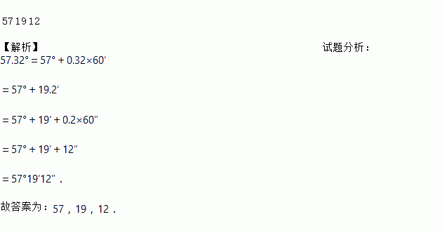 57 19 12 【解析】试题分析:57.32°=57°+0.32×60′ =57°+19.2′ =57°+19′+0.2×60″ =57°+19′+12″ =57°19′12″. 故答案为:57,19,12.