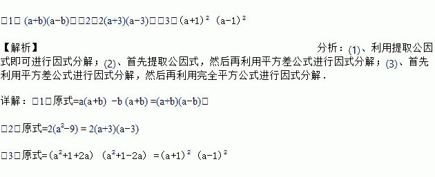 ① a(a+b)-b(b+a); ② 2a2-18; ③(a2+1)2-4a2.