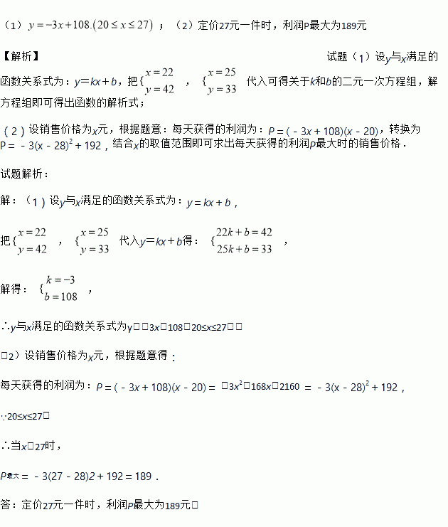 在“母亲节”前夕,我市某校学生积极参与“关爱贫困母亲”的活动,他们购进一批单价为20元的“孝文化衫”在课余时间进行义卖,要求每件销售价格不得高于27元,并将所得利润捐给贫困母亲。经试验发现,若每件按22元的价格销售时,每天能卖出42件;若每件按25元的价格销售时,每天能卖出33件.假定每天销售件数y(件)与销售价格x(元/件)满足一个以x为自变量的一次函数.